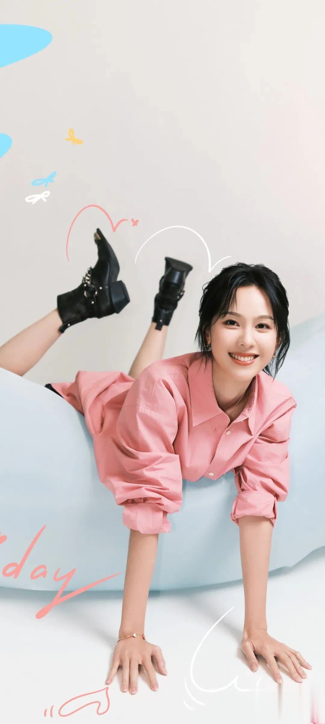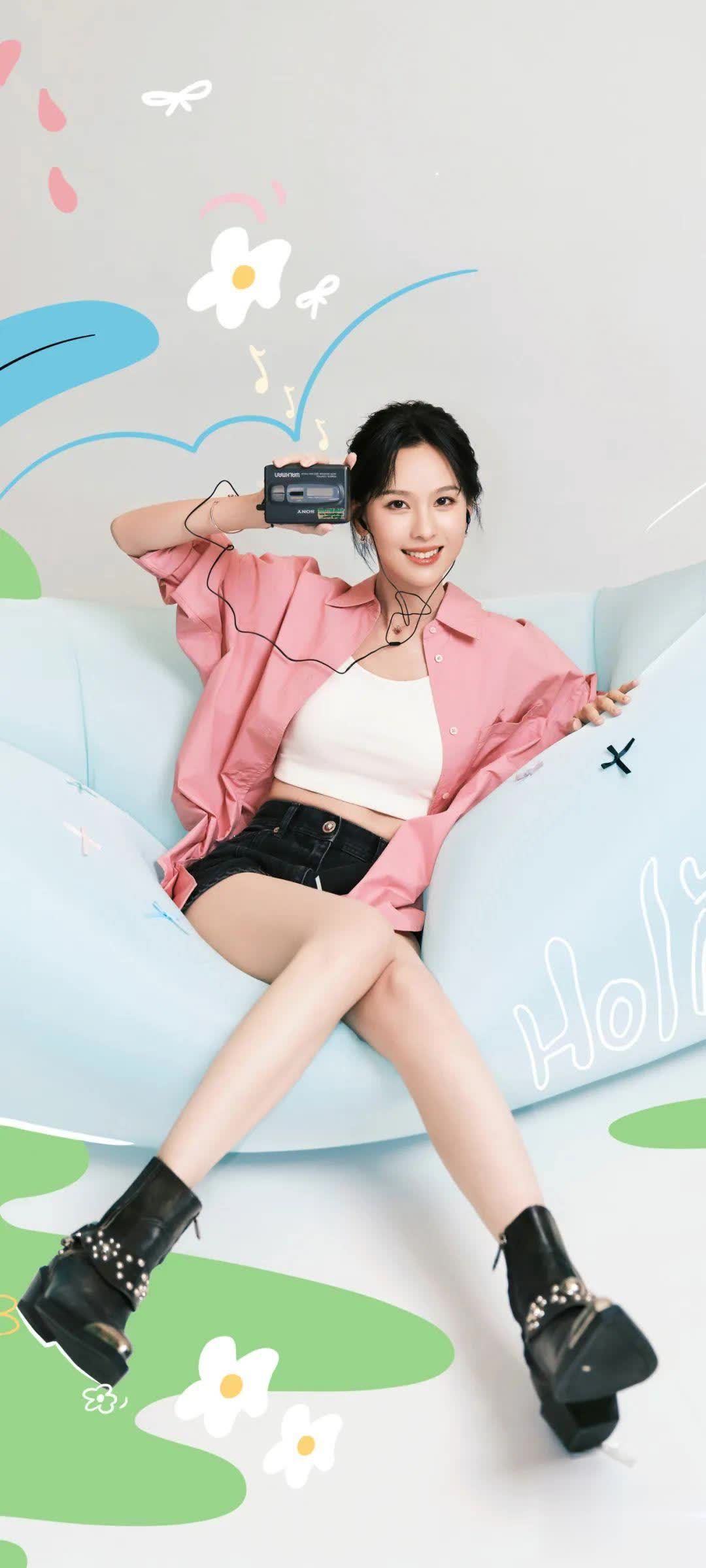 当背景换上彩色涂鸦元素,陈都灵的笑容更加明媚。音符、花朵、爱心等图案环绕,与她手中的随身听相呼应,整个画面充满了青春活力。粉色衬衫在这样的背景下,显得愈发甜美,仿佛将春日的美好都凝聚在了这一帧帧画面中。