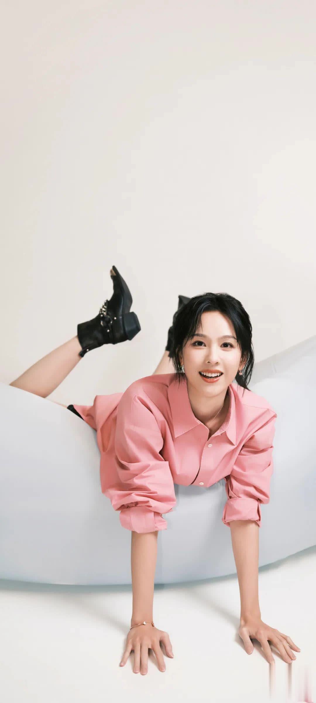 最后这张趴在沙发上的写真,陈都灵笑容灿烂,仿佛将快乐传递给每一位观者。黑色短靴与粉色衬衫的搭配,在简约背景下更显突出,整套造型的时尚感与个人魅力完美融合。