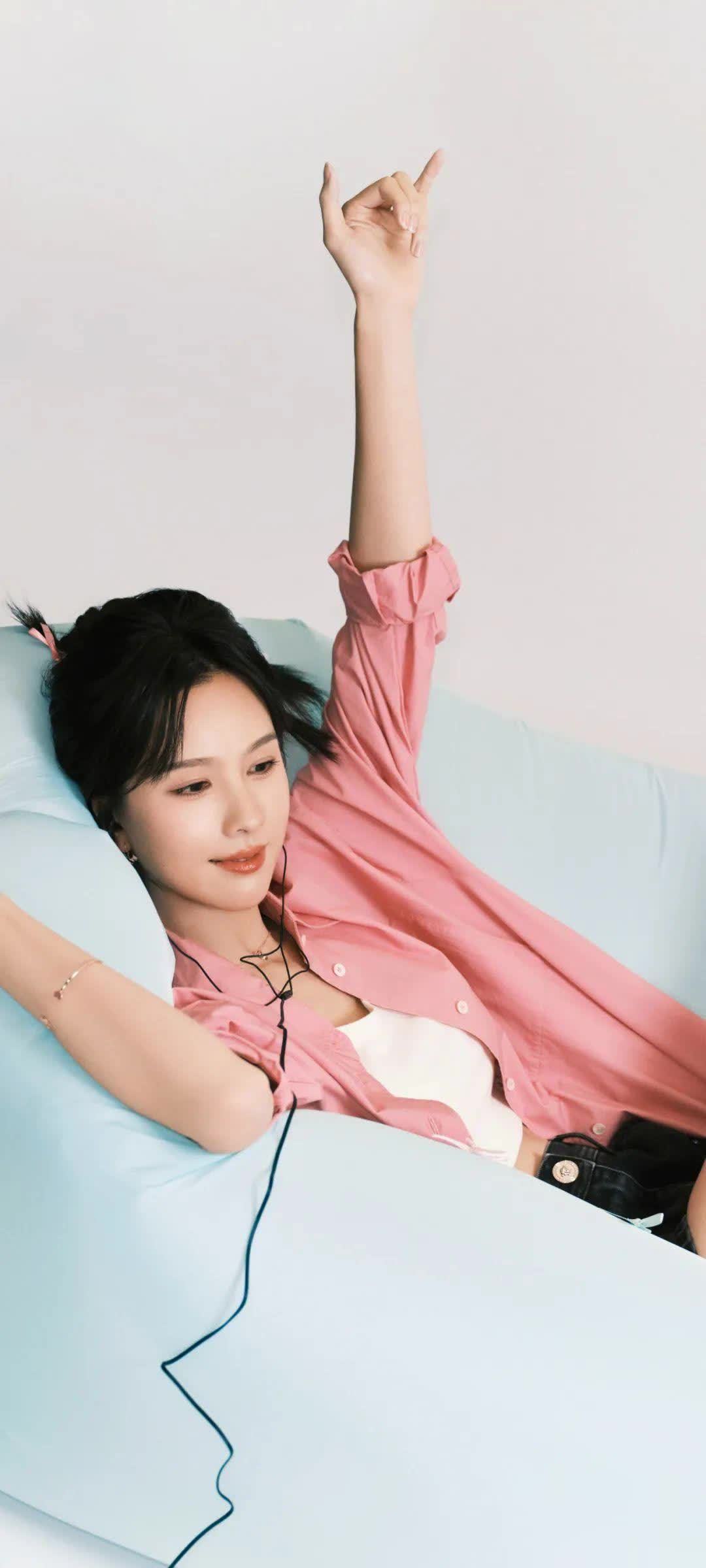 侧躺的画面中,陈都灵手持随身听,眼神温柔又自信。浅蓝色沙发上的装饰与背景的彩色图案相呼应,整体色调和谐统一。粉色衬衫在这样的场景中,既显温柔又不失时尚感,将甜酷风的 “甜” 字诠释到位。