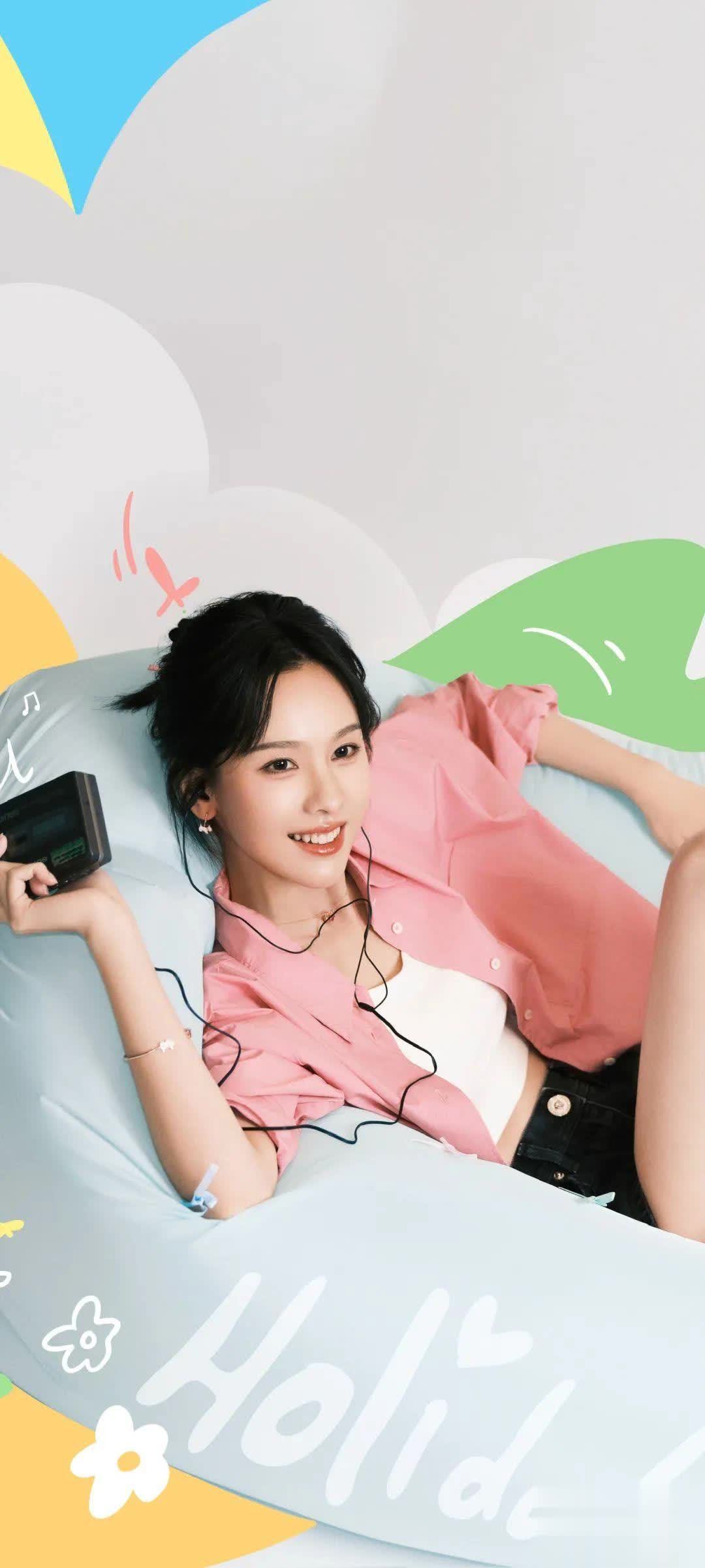 举着随身听放在耳边的画面,仿佛让人听到了流淌的音乐。背景中 “Holiday” 字样与彩色图案,强化了度假般的轻松氛围。陈都灵的眼神中既有少女的灵动,又有成熟女性的时尚表现力,多种魅力交织。